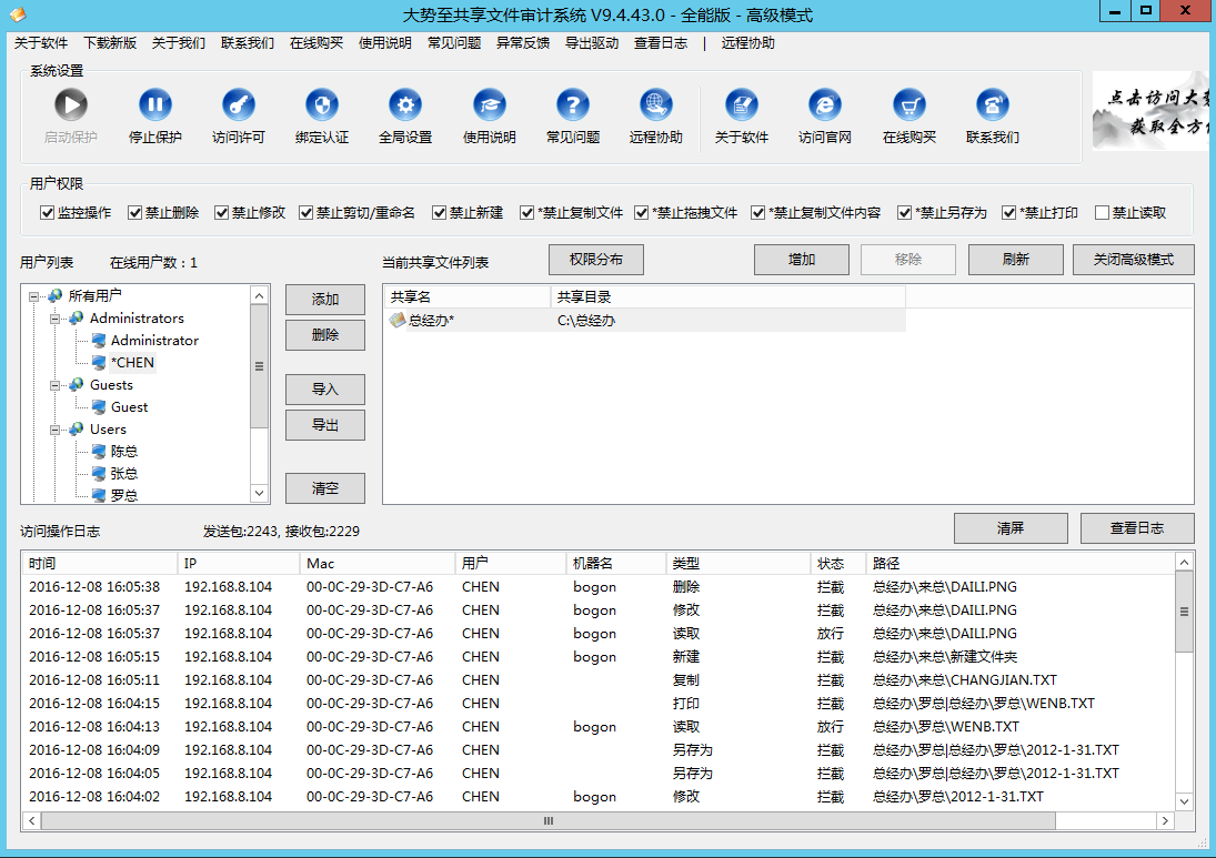 如何设置服务器共享文件访问权限?通常的做法是通过操作系统的文件夹访问权限设置功能,并配合服务器登录账号进行限制。有些用户还会通过windows 域控制器进一步设置服务器共享文件的访问权限,但是操作相对复杂,不适合没有专门网管员的单位使用。这种情况下,可以借助于专门的服务器共享文件管理软件、局域网共享管理工具来实现。