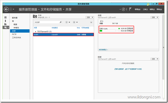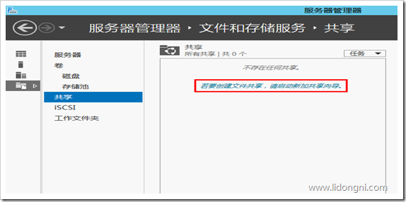 1、点击“文件和存储服务”选择“共享”,然后点击“若要创建文件共享,请启动新加共享向导”