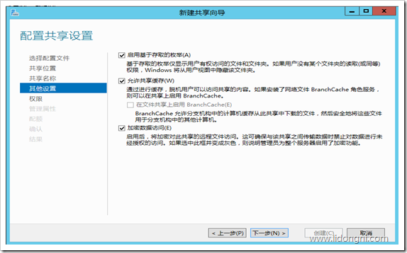 启用基于存取的枚举:简单一点说就是如果a用户只能访问a目录的权限,那他就不会看到共享下面的b目录,就不会出现点击b目录没有访问权限的提示了,这样增强了用户体验,同时也加强文件服务器的安全性。