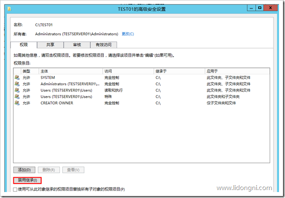 7、我们先禁用继承的权限,再手动添加权限