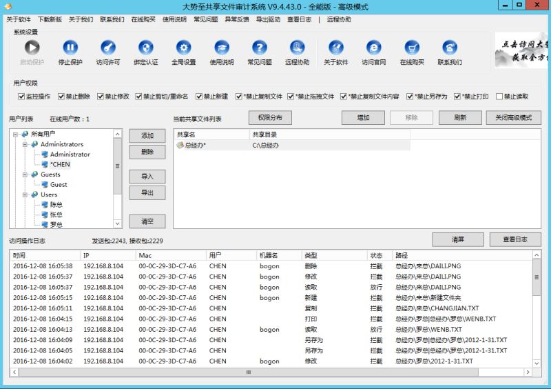 此外,通过本系统还可以详细记录局域网用户访问共享文件的日志,从而便于管理员事后备查和审计。