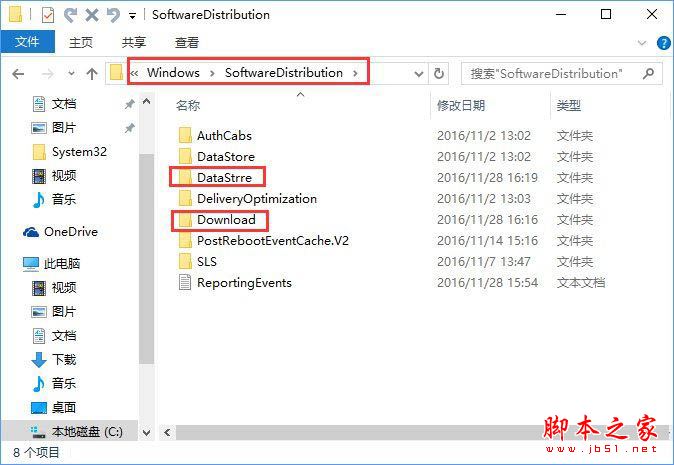 3、接着关闭窗口,并在“此电脑”页面中,按序点击打开:windows\softwaredistribution,把datastore和download两个文件夹删除就行了。