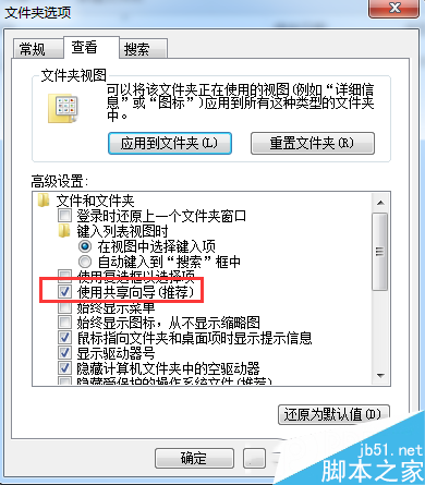 2、在文件夹选项窗口中,切换至“查看”项,在高级设置下面勾选“使用共享向导”,点击确定即可。
