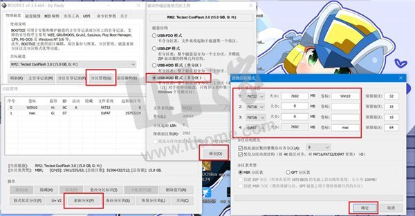 对于分区设置,如果你只想弄两个分区,请将2和3分区的大小设置成0mb,然后分区1设置成fat32,分区4设置成exfat,并填写好各个分区的卷标以便后续操作。