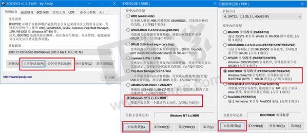 假如硬盘是mbr分区表,接下来请使用bootice为这个移动硬盘写入windows nt 6.x的主引导记录(mbr),以及为系统安装文件所在分区写入bootmgr的分区引导记录(pbr)。如果是pe镜像的话,请根据实际情况进行处理。如果是gpt分区表,或者不需要支持legacy模式启动,那么此步骤可以不用做。