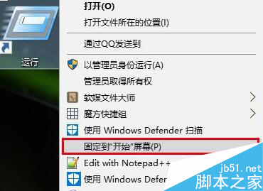 4、鼠标右键运行图标,选择固定到“开始”屏幕即可,如图所示: