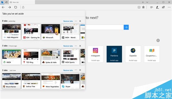 退出打开的选项卡后可快速恢复,还可以预览网页缩略图,选择恢复当时离开的单个或若干网页。