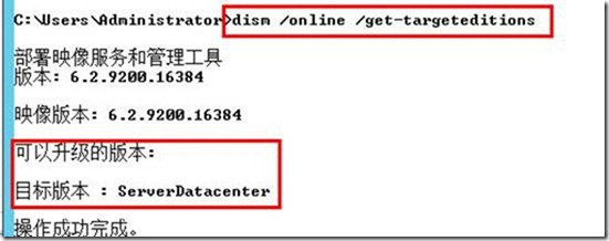 (2)进入命令提示窗口,执行dism /online /get-targeteditions,查看当前系统可以升级的版本,显示可以升级到datacenter,如图2所示。