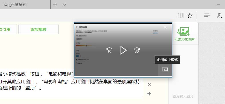 5、单击“以最小模式播放”按钮,“电影和电视”应用窗口将变成一种精简模式。这时,再打开其他应用窗口,“电影和电视”应用窗口仍然在桌面的最顶层保持可见,也就是所谓的“置顶”。