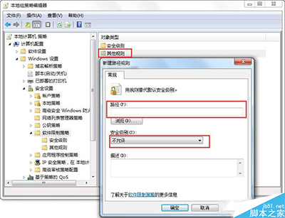 2、再从左侧选择“其他规则”。在右侧窗格空白处右击,在菜单中选择“新建路径规则”项。在弹出的窗口中,点击“路径”后的“浏览”按钮,选择c:\windows\system32文件夹下的wscript.exe文件,并将“安全级别”设置为“不允许的”。将c:\windows下的system32、dllcache和i386这三个文件夹下wscript.exe的扩展名去除,以防止病毒突破限制运行。