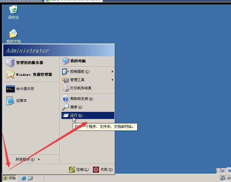 1、首先我打开windows server 2003操作系统,在单击开始-运行。
