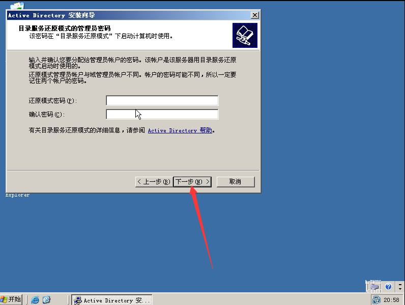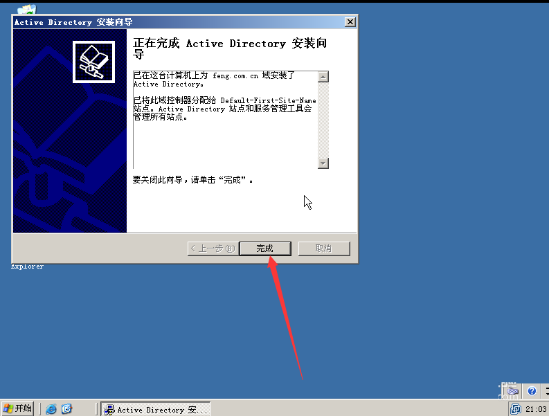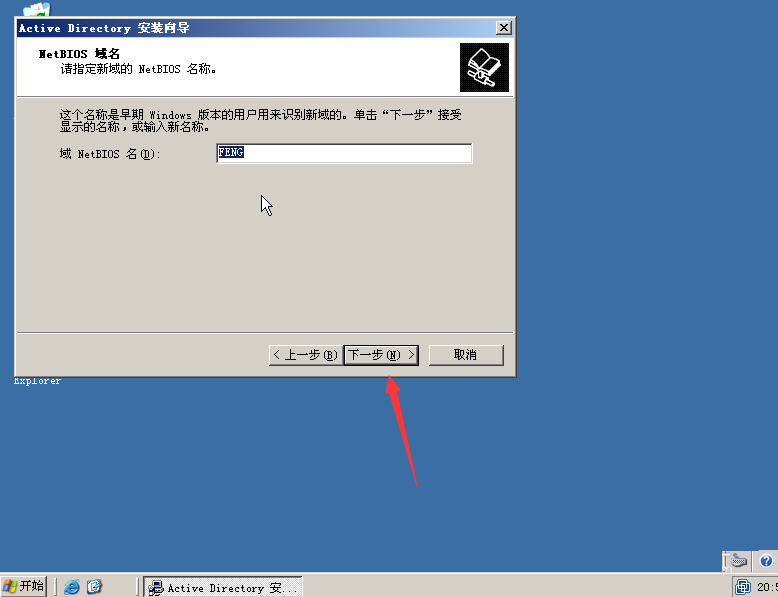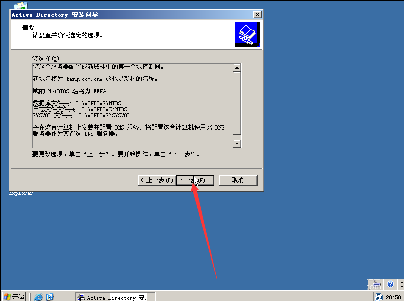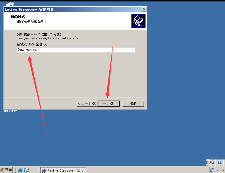 7、这里最重要了,如下图就是域的名字了,这里是输入feng.com.cn在单击下一步。