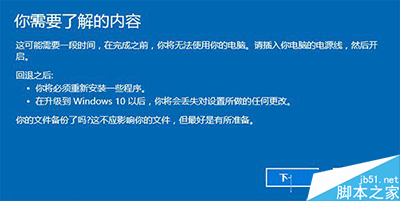 3、仔细阅读注意事项,全过程需要有稳定电源支持,也就是说笔记本和平板电脑需要在接入电源线的状态下进行回退操作,电池模式不被允许;另外,系统还提示了一些关于文件和程序可能受到的影响。了解并采取措施之后,点击“下一步”继续。