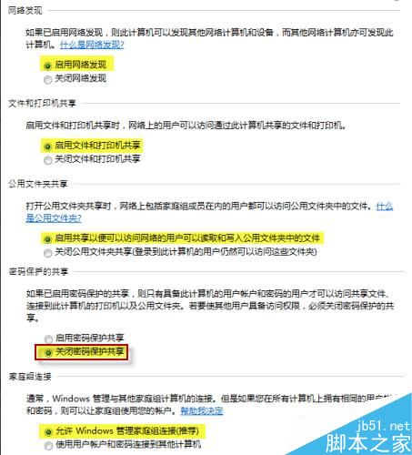 启用“网络发现”、“文件和打印机共享”、“公用文件夹共享”;“密码保护的共享”部分则请选择“关闭密码保护共享”。