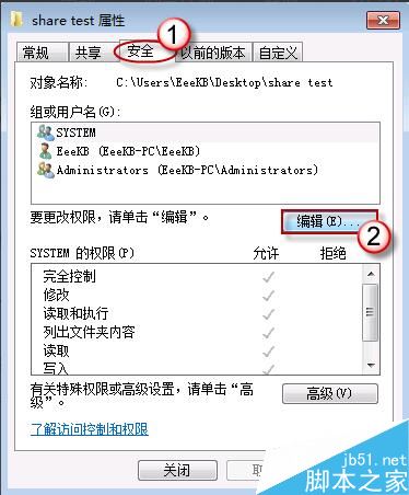 在前面第二步中,我们已经关闭了密码保护共享,所以现在要来对共享文件夹的安全权限作一些更改。右键点击将要共享的文件夹,选择“属性”。在“安全”页上,单击“编辑” 。