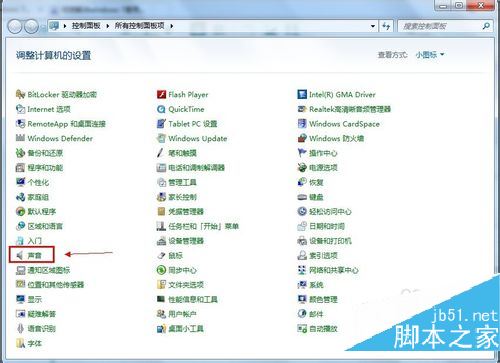 单击“开始”菜单,单击“控制面板”项,单击“声音”项