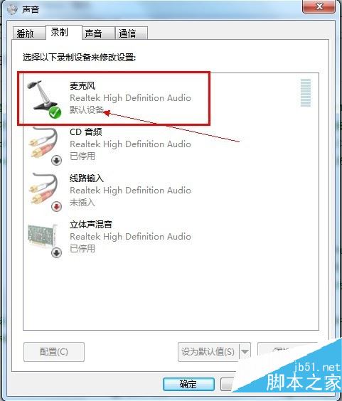 切换到“录制”选项卡,看看麦克风是否被设置为默认设备(注:有的声卡可能会显示多个麦克风选项)
