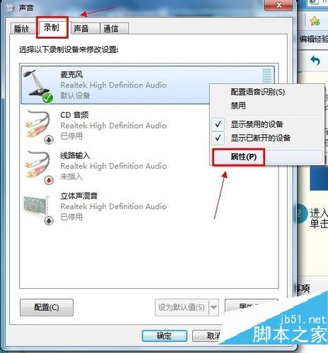 进入“声音”对话框,切换到“录制”选项卡,直接双击“麦克风”选项或鼠标右键单击“属性”命令
