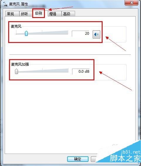 切换到“级别”选项卡,将“麦克风”和“麦克风加强”的音量调大,单击“确定”按钮使设置生效(注:麦克风加强的音量调得太大,听到的回声也会很大)