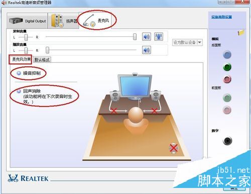 切换到“麦克风”标签,在“麦克风效果”选项下选择“噪音抑制”和“回声消除”功能