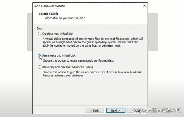 6、选择使用现有虚拟磁盘选项,然后单击下一步。