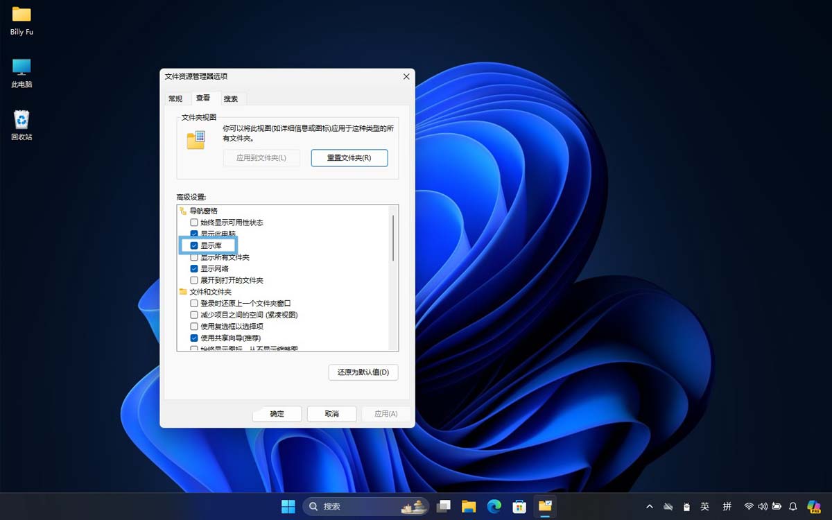 3、在「高级设置」中,勾选「显示库」,然后点击「确定」。