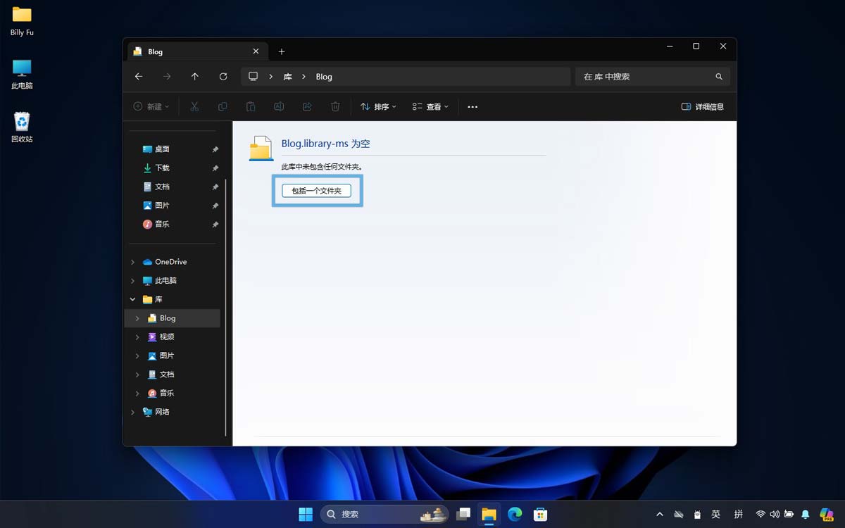 4、新创建的「库」将出现在导航窗格中。打开它,然后点击「包括一个文件夹」。