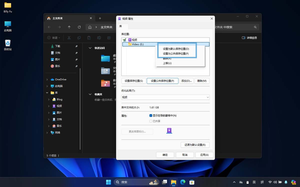 - 默认保存位置:每个「库」都有一个默认保存位置。当你将文件保存或拖动到该「库」时,如果没有指定具体位置,文件会自动保存到默认位置。默认情况下,windows 11 为以下四个库设置了默认保存位置: