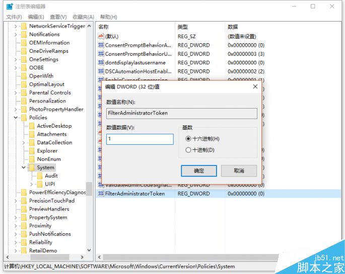 在右侧栏找到filteradministratortoken,双击后将数值数据修改为“1”之后点击“确定。如果没有的话,就使用鼠标右键新建个dword(32位)值,将其命名为filteradministratortoken。
