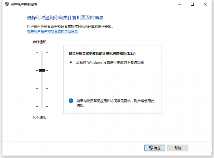 完成上述操作后,重启电脑或注销当前windows账户后,再进入“控制面板-系统与安全-用户账户控制设置”,将“通知选项”设置为默认就ok了。