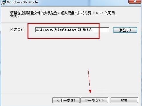 4、指定虚拟硬盘文件的安装位置。一般不要安装到系统分区,原因是假如主分区读写过于频繁,会导致xp模式运行效率下降,单击【下一步】继续;