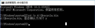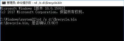 2、在命令提示符中输入: rd /s x:ecycled 按下回车键 x代表出现问题的磁盘盘符,如d盘出现问题那么这么输入:rd /s d:ecycled