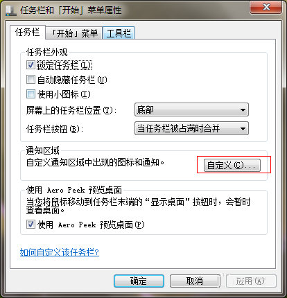 2、然后在任务栏和属性菜单的中间位置设置通知区域,点击自定义进入设置;