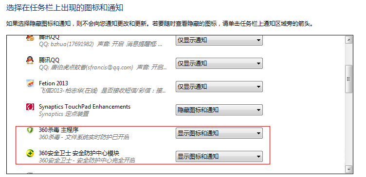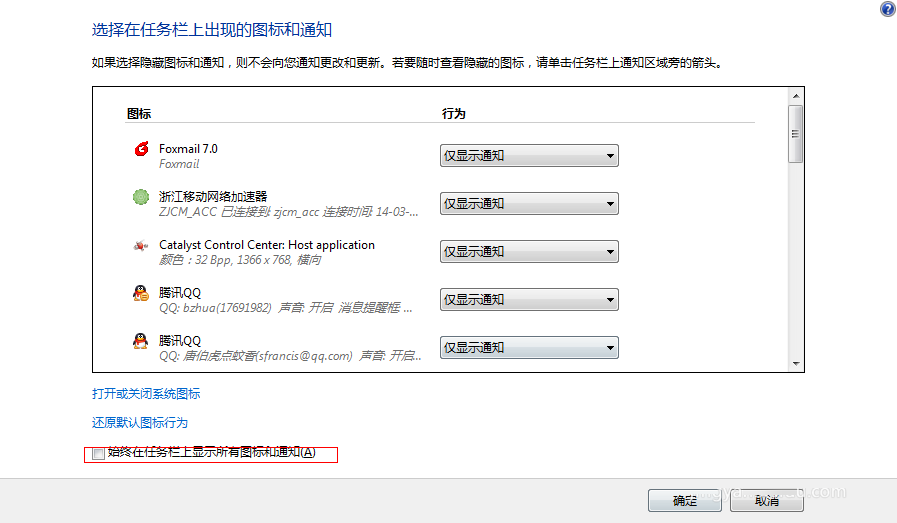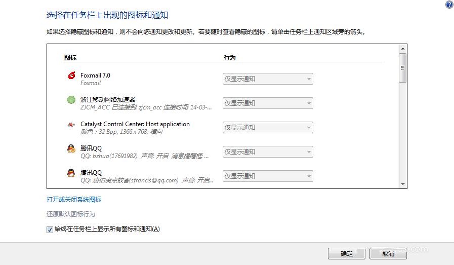 4、在可编辑图标行为那里,有显示图标的说明是显示在通知区域的,其他都是隐藏图标;