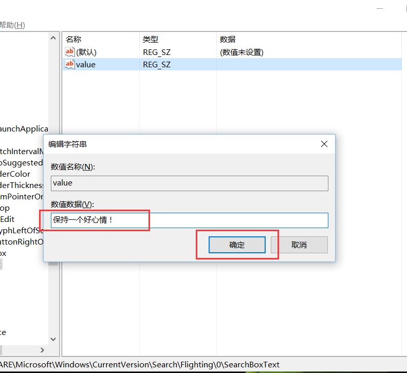 9、接下来,我们双击打开新建立的“value”选项,然后修改其键值,键值中的文字,即为我们想要修改的选项,这里我输入了自己想要看到的话。