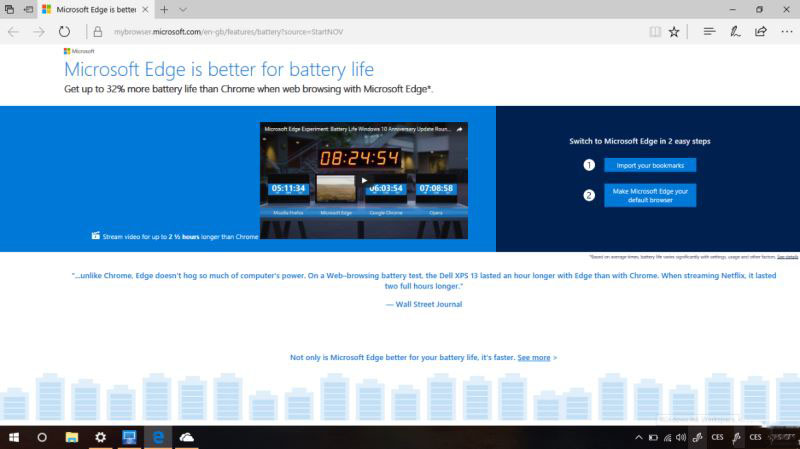 如下面的截图所示,微软现在在开始菜单“建议”区域上推广edge的效率功能。在本例中,微软正在推广edge的视频流传输能力,一旦点击广告,微软就会将用户转到一个页面,公司会将edge的电池使用情况与google chrome进行比较。在该页面中,微软声明,用户可以“在使用microsoft edge浏览时,比chrome高出32%的电池寿命”。