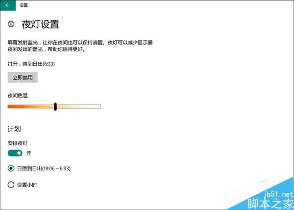 在win10创作者更新中,你可以很容易在右下角操作中心看到一项名叫”夜灯“的小按钮。通俗来讲,夜灯就是我们日常所说的去蓝光设置。在这项功能下,你可以任意调整屏幕色温,以减少屏幕蓝光对于人眼的刺激。或者自定义夜灯的开启与关闭时间,让它按日出日落,或者某一特定的时间段定时开关。总之夜灯是新版win10中一项很有名的设置,能够让经常在夜间工作的人们更舒适一些。