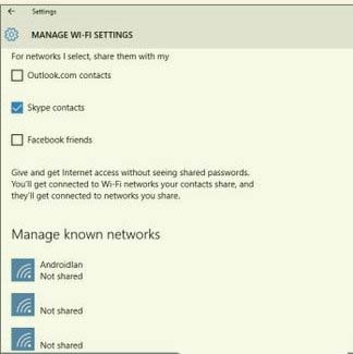 在你想共享你的wi-fi账号密码前,需要确保这两个选项是开着的。如果你已经设置好我们提到过的几个选项了的话,现在我们需要转到“将我选择的网络和我的…共享”这一栏,然后在facebook, outlook.com或者skype中选择你想分享账号的联系人,打钩就可以了。