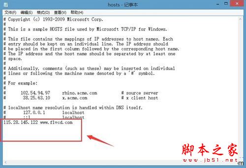 4、在最后加上一行,内容为115.28.145.122 www.flvcd.com。