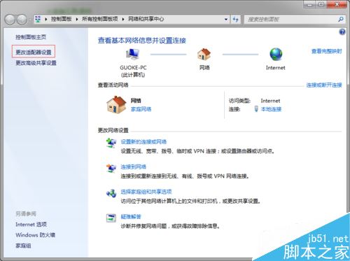 打开“网络和共享中心”页面,点击“更改适配器设置”进入网络连接页面