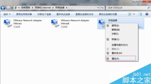 在“网络连接”页面中,右击本地连接,打开属性页面
