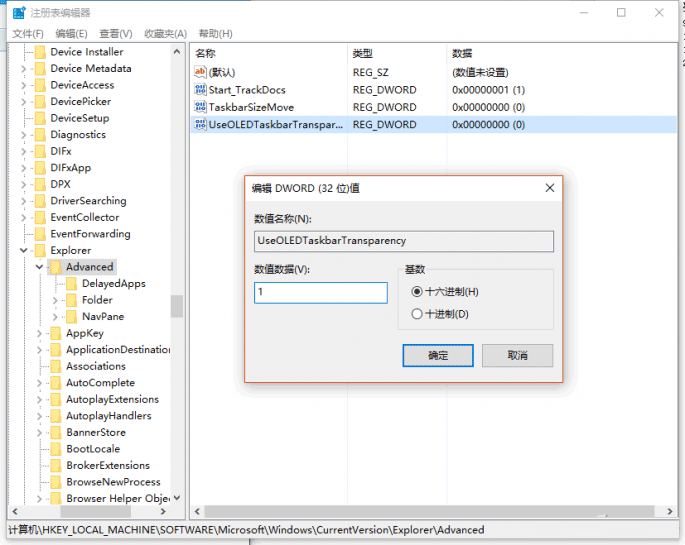 在右侧新建个名为useoledtaskbartransparency的dword(32位)值,并将数值数据修改成为1。