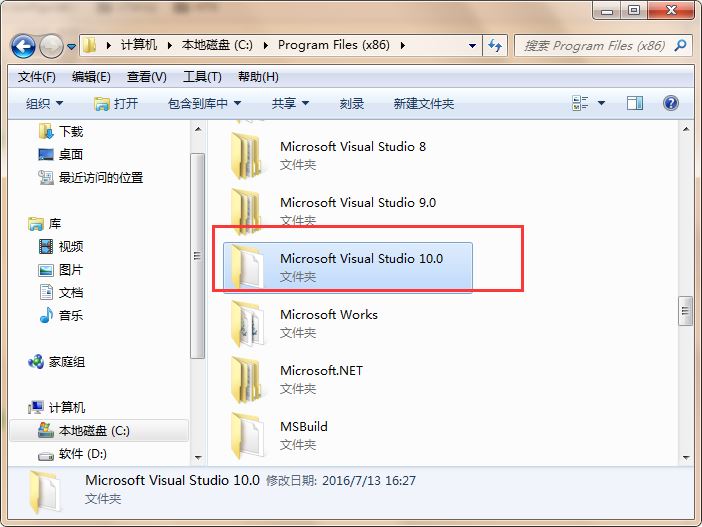 我们一直往上层寻找,直到找到,名字是程序全名的文件夹,(该文件夹下是vs2010的所有文件),比如我的文件夹是“microsoft visual studio 10.0”