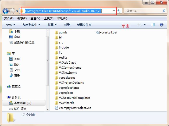 接着我们进到vc文件夹下;有鼠标单击上面的目录栏;如图中所示;