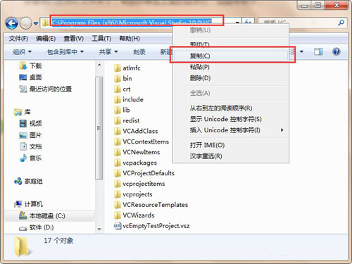选中后,我们单击右键,在下拉菜单单击“复制”,这样我们就可以得到完整的目录了;我们的目录是“c:\program files (x86)\microsoft visual studio 10.0\vc”