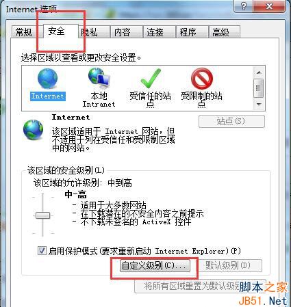 2、打开internet选项中的安全标签,点击“自定义级别”;