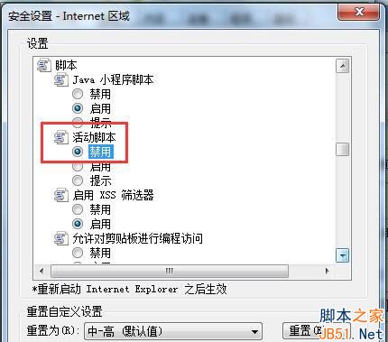 3、在自定义选项中找到活动脚本选项,勾选“禁用”,然后点击确定即可。