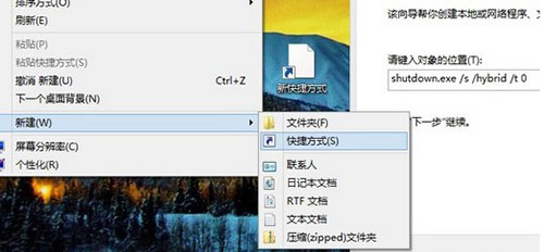 第一:在桌面上,点击鼠标右键——新建——快捷方式,在方框中输入以下命令内容:shutdown.exe /s /hybrid /t 0(如下图)