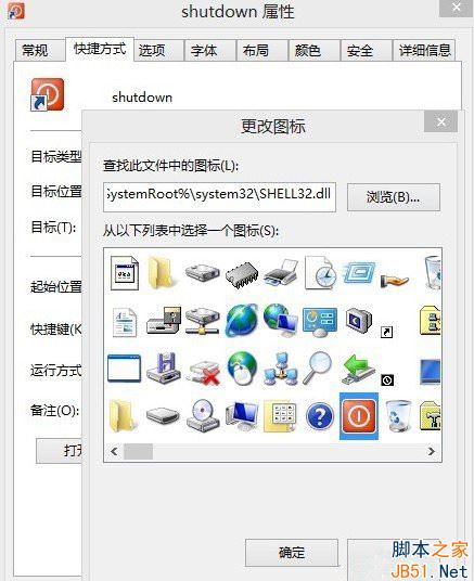 第三:更改图标,点击右键——属性——更改图标。建议选择一个关机图标,点确定。