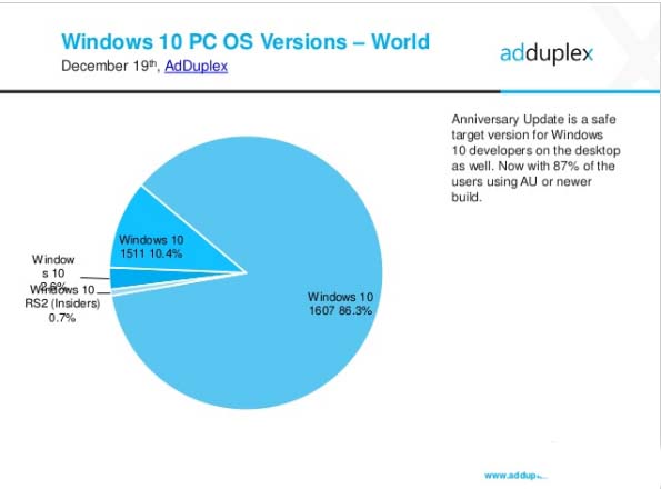 按照去年底adduplex的统计,在windows 10已经公布的三个稳定版中,build 14393(version 1607)的用户最多,而1507仅占比2.6%,约900万用户。微软仅仅计划支持最新的两个build,也就是10586和14393。